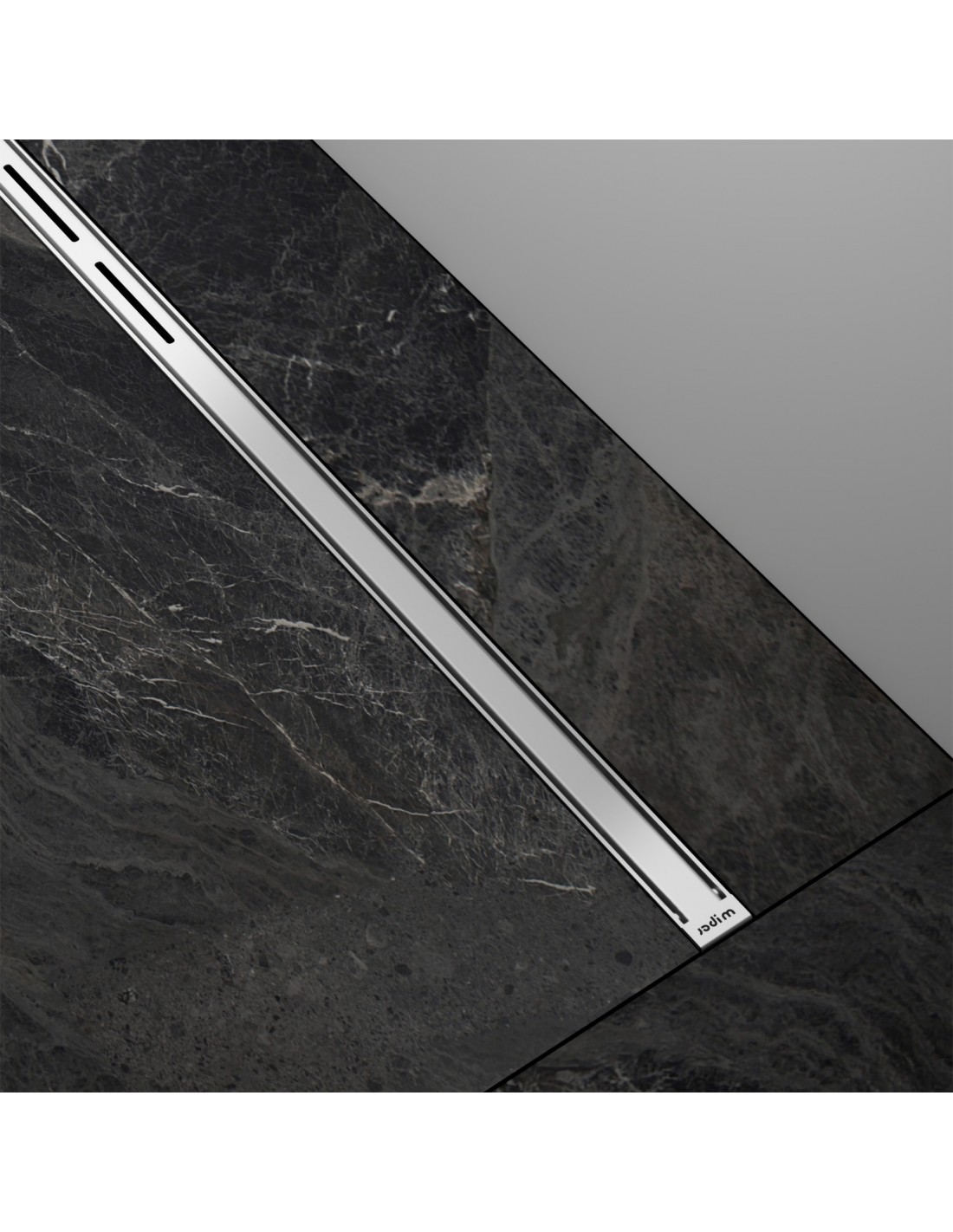 Wat betreft de doucheplaat met de Premium Ponente afvoer: het rooster en de flens zijn niet op hetzelfde niveau. Er is een verschil van 15 mm en het rooster zelf is de uiteindelijke look, omdat het niet mag worden bedekt met afwerkingsmateriaal. Dit is een perfecte afvoer voor tegelvloeren, met tegels van standaarddikte vanwege de lip, waardoor u de randen tussen de flens en de afdekking mooi en gemakkelijk kan afwerken. Ponente is een gewoon roestvrijstalen patroon zonder gaten, een stevige staaf van geborsteld staal.