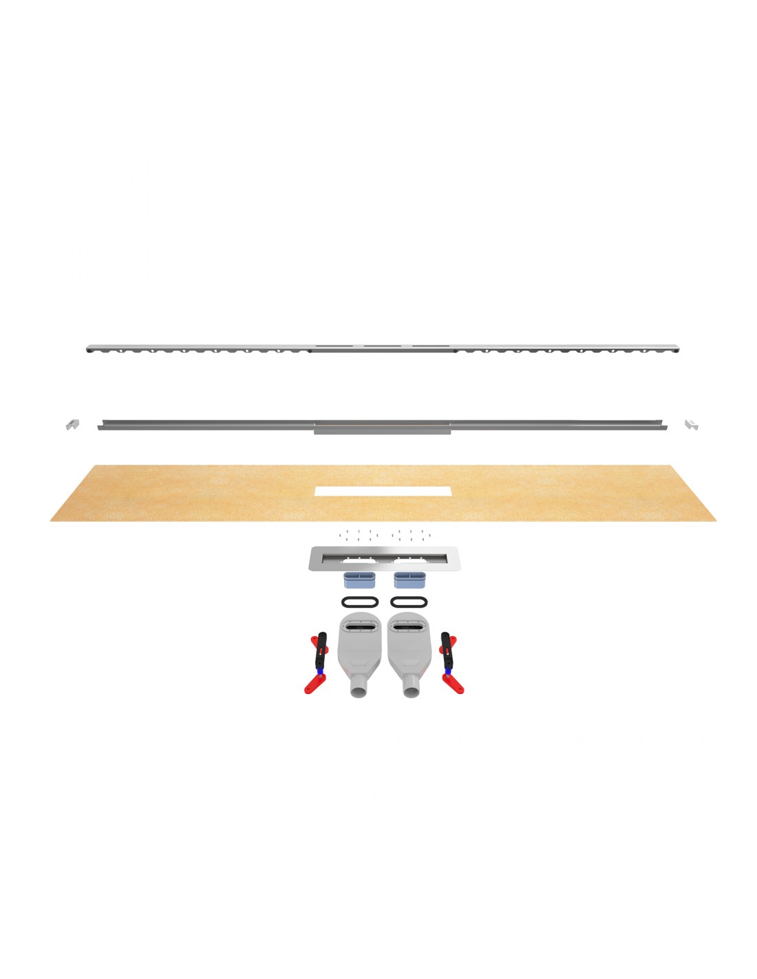 De trimbare membraankraag zorgt ervoor dat de afvoer compatibel is met hydro-isolatiesystemen, en de stalen verpakking kan ook als gietvloergeleiders worden gebruikt met de extra verstelbare nivelleerpoten van polycarbon die in de set worden meegeleverd.