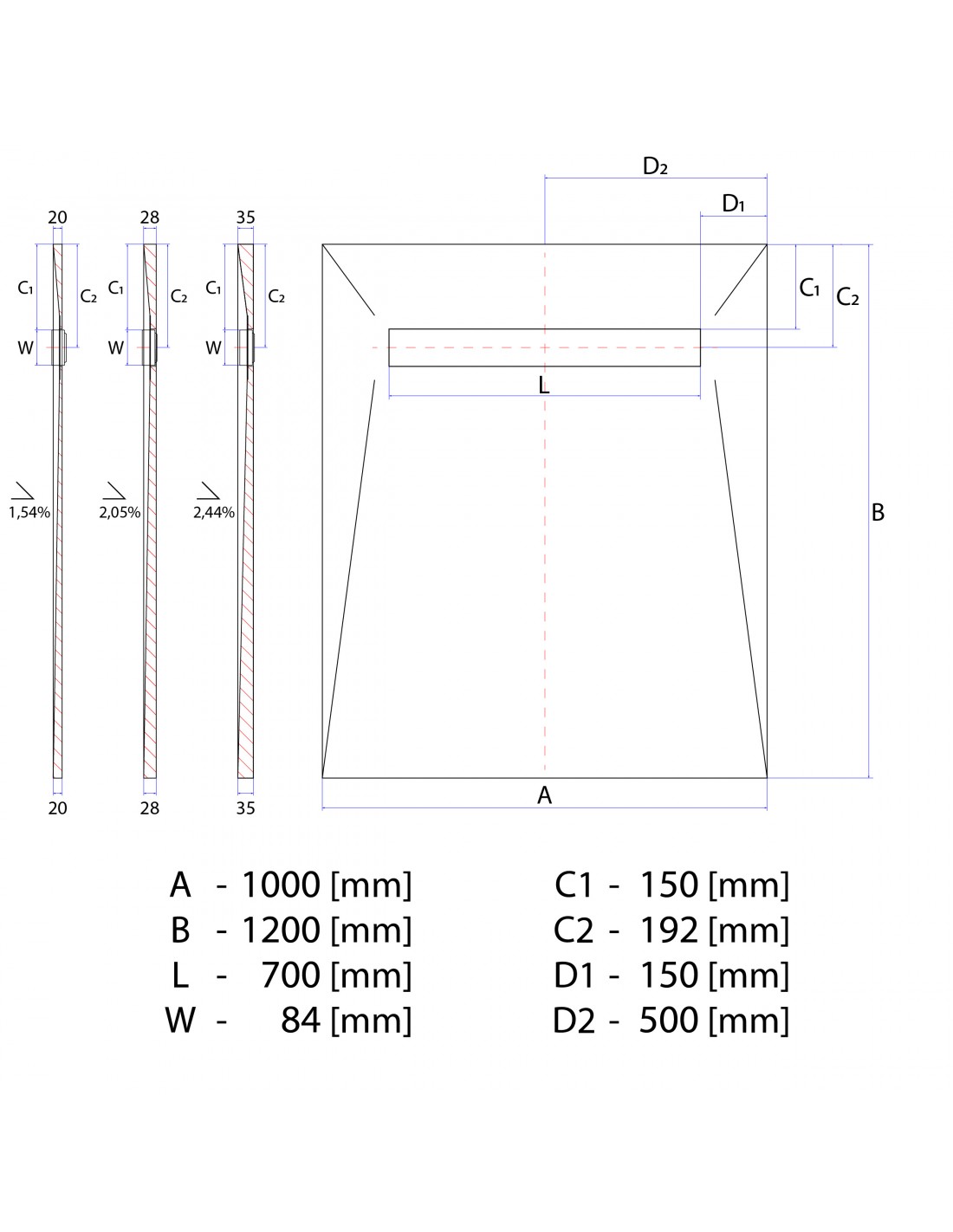 Inbegrepen onderdelen Technische specificatieDit is de basis voor een inloopdouche. De doucheplaat bestaat uit hard XPS-schuim dat aan beide zijden is gecoat met een elastische kleeflaag die is versterkt met een glasvezelgaas. Afwerking kan met tegels van elk formaat of met mozaïek. Speciale groeven in de richting van de afvoer maken het gemakkelijker om het juiste afschot te krijgen bij het betegelen. Afhankelijk van het type vloer en de maat van het afschot waar u uit wilt kiezen, zijn er drie plaatdiktes: 20, 28 en 35 mm.