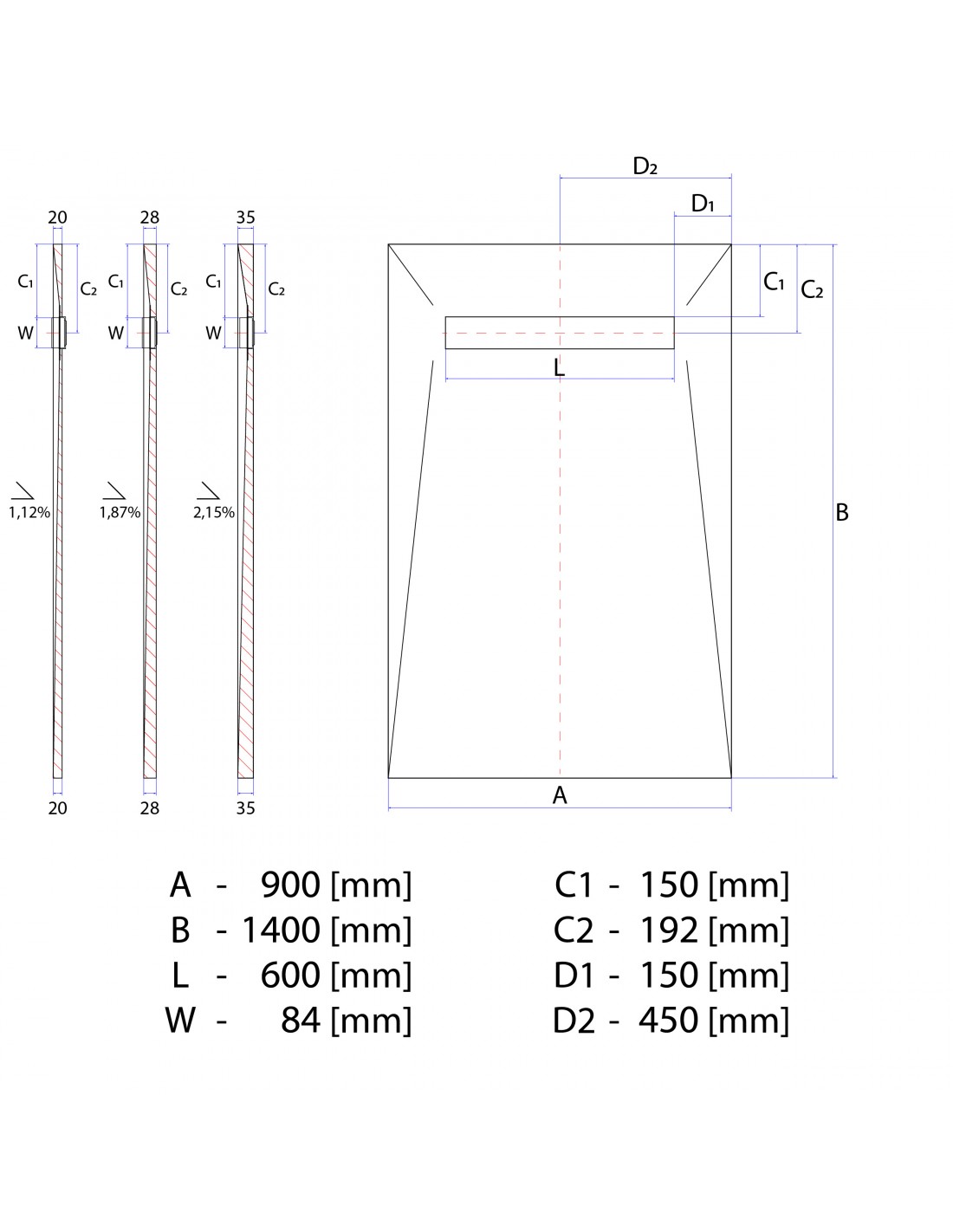 Inbegrepen onderdelen Technische specificatieDit is de basis voor een inloopdouche. De doucheplaat bestaat uit hard XPS-schuim dat aan beide zijden is gecoat met een elastische kleeflaag die is versterkt met een glasvezelgaas. Afwerking kan met tegels van elk formaat of met mozaïek. Speciale groeven in de richting van de afvoer maken het gemakkelijker om het juiste afschot te krijgen bij het betegelen. Afhankelijk van het type vloer en de maat van het afschot waar u uit wilt kiezen, zijn er drie plaatdiktes: 20, 28 en 35 mm.