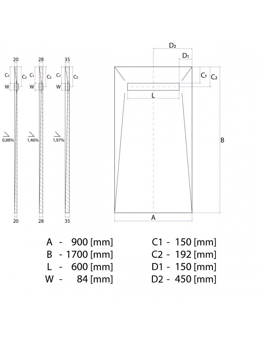 Dit is een inloopdouche. De plaat bestaat uit hard XPS-schuim dat aan beide zijden is gecoat met een elastische kleeflaag die is versterkt met een glasvezelgaas. Het kan worden afgewerkt met keramische tegels van elk formaat of mozaïek. Speciale groeven in de richting van de afvoer maken het gemakkelijker om het juiste afschot te krijgen bij het betegelen. Afhankelijk van het type vloer en de maat van het afschot waar u uit wilt kiezen, zijn er drie plaatdiktes: 20, 28 en 35 mm.