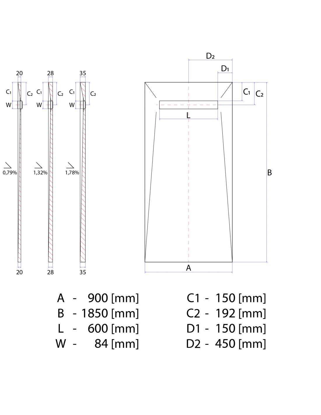 Dit is een inloopdouche. De plaat bestaat uit hard XPS-schuim dat aan beide zijden is gecoat met een elastische kleeflaag die is versterkt met een glasvezelgaas. Het kan worden afgewerkt met keramische tegels van elk formaat of mozaïek. Speciale groeven in de richting van de afvoer maken het gemakkelijker om het juiste afschot te krijgen bij het betegelen. Afhankelijk van het type vloer en de maat van het afschot waar u uit wilt kiezen, zijn er drie plaatdiktes: 20, 28 en 35 mm.
