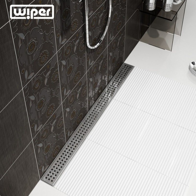 Wat betreft de doucheplaat met de Premium Ponente afvoer: het rooster en de flens zijn niet op hetzelfde niveau. Er is een verschil van 15 mm en het rooster zelf is de uiteindelijke look, omdat het niet mag worden bedekt met afwerkingsmateriaal. Dit is een perfecte afvoer voor tegelvloeren, met tegels van standaarddikte vanwege de lip, waardoor u de randen tussen de flens en de afdekking mooi en gemakkelijk kan afwerken. Ponente is een gewoon roestvrijstalen patroon zonder gaten, een stevige staaf van geborsteld staal.